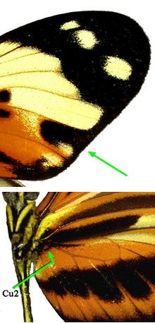 face ventrale des ailes postérieures, à l'angle interne de Cu2. |