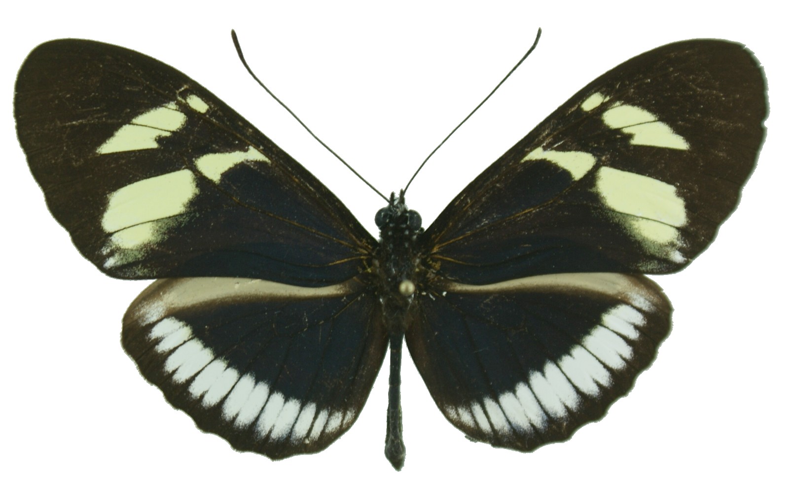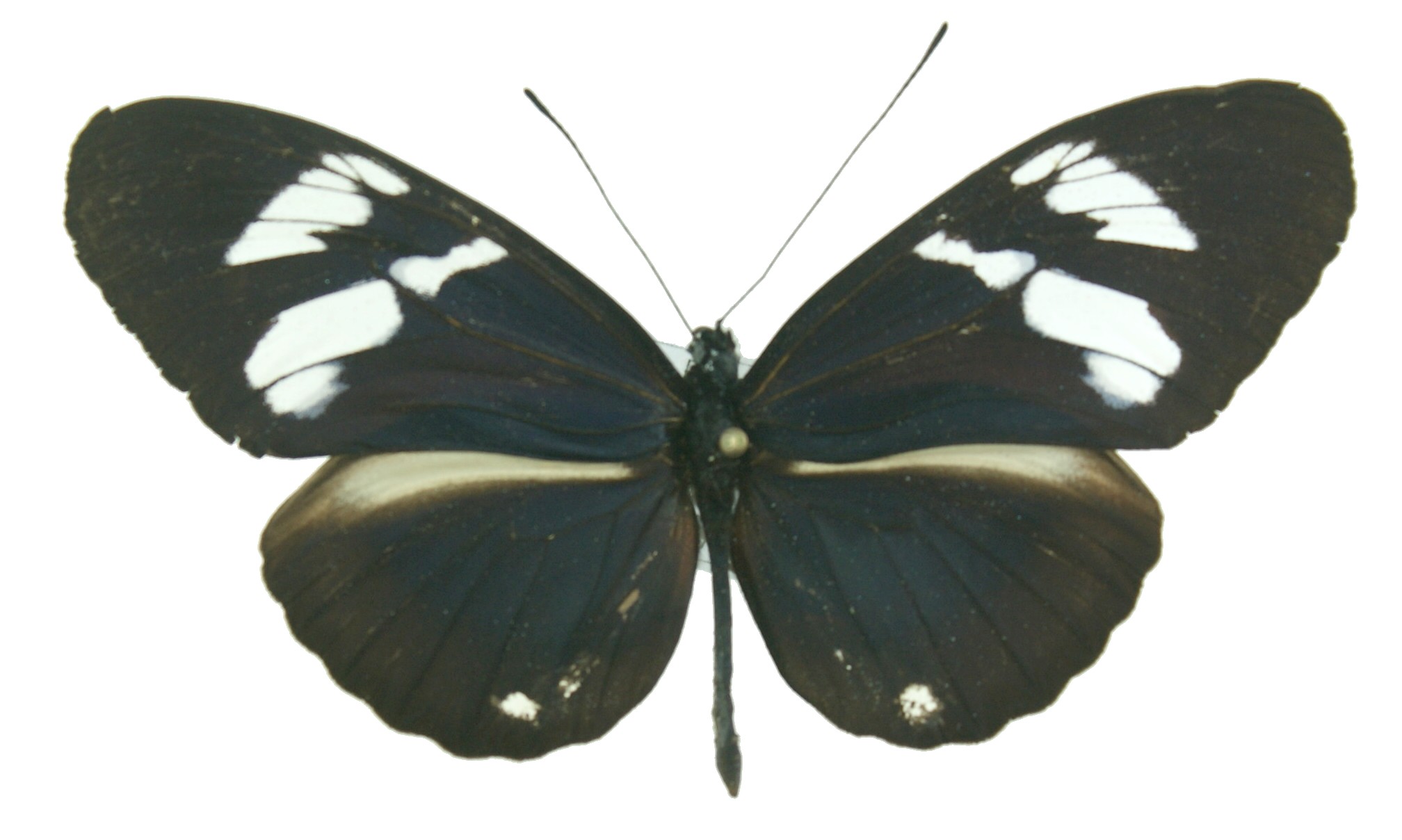 Décrite de Colombie (Cauca, Rio Dagua). La bande blanche aux postérieures est plus fine et fragmentée par le noir des veines.