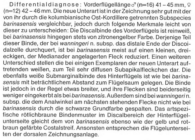 Voir funet: cydno wanningeri Neukirchen, 1991; , TL: Colombia Colombie (Région du Rio Suarez) NEUKIRCHEN, W. (1991) "Eine neue Heliconius-Form aus Ost-Kolumbien (Lepidop-tera: Nymphalidae)". Entomologische Zeitschrift 101(6): 108-110 Lire description