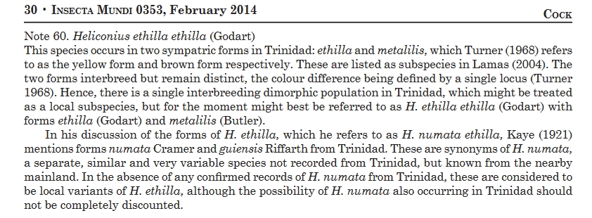 WEYMER, G. (1894) "Revision der ersten Gruppe der Gattung Heliconius". Deutsche entomologische Zeitschrift "Iris" 6(2): 281-345 (flavidus) Lire PDF BOULET, E. & LE CERF, F. (1909) "Descriptions de formes nouvelles d'héliconides (Lépidoptères Rhopalocères) de la collection du Muséum. Bulletin du Muséum national d'Histoire naturelle" (Paris) 15(7): 459-463 (depuncta) COCK, J.W. (2014) "An updated and annotated checklist of the larger butterflies (Papilionoidea) of Trinidad, West Indies: Papilionidae, Pieridae and Nymphalidae" Insecta Mundi. Paper 858 Lire PDF