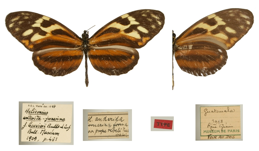 Funet: Heliconia fornarina Hewitson, 1854; Ill. exot. Butts [1] (Heliconia II-III): [73], pl. [38], f. 9, TL: ["S. Amer."] Mexique (Veracruz, Oaxaca, Chiapas), Guatemala, El Salvador, Nicaragua, Costa Rica (San José)