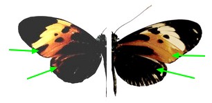 Postérieures: entièrement noire à l'exception de 2 point jaunes à l'apex et quelques points blancs sur le bord de l'aile.