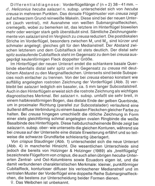 Funet: hecuba salazari Neukirchen, 1993; , TL: Colombia Colombie (Choco, Nord de la vallée de Calima) NEUKIRCHEN, W. (1993) "Eine neue Subspecies von Heliconius